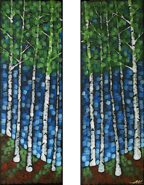 | "Green Ridge Birches" Acrylic on 12"wx4"h canvas |
