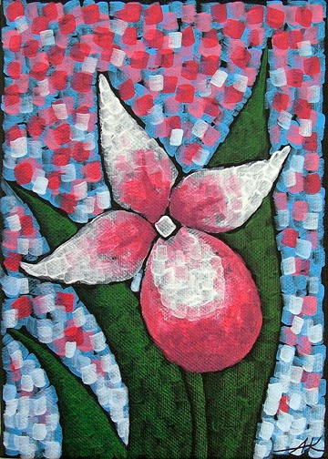 April showers bring May flowers. Except here in northern Minnesota, where the landscape is still covered by a thick blanket of snow in April. The sunny 50 degree temps may do something about that snow this week, however. I painted a series of flowers pushing up through the snow last week, as we were getting hit by a couple snowstorms and spring seemed like a fleeting dream, and this is one of the new works titled
